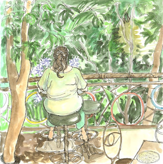 a lively place to go on a Saturday. Moyo restaurant where I've sketched before was abuzz with customers, but we started on a quiet balcony overlooking a solitary woman working on her laptop amongst the treetops - she was the unwitting model for a couple of us - my daughter included, who I was delighted to have with us. I sketched the same mosaic angels that I've done before, but I think I might save them for a Christmas post a bit later in case I don't get anything else done. I then wandered around until I found where the others had got to - Barbara was busy drawing these guys selling wire bicycles and xylophones but they had tired of posing by then and I had to scribble them down fast. We went down to the water's edge and sketched the ice cream man and his bell ringer, after which I felt quite sketched out and went home - lots more subject matter down there for another trip!