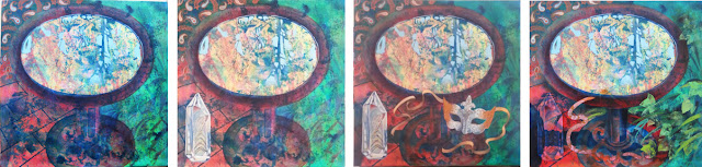 These you may (or well may not) recognise from a previous post on Greg Kerr's Objets Trouvé workshop in 2014. Below are some of the stages these 60 x 60 cm paintings have gone through, some rather tortuously, via a series of processes. Splashing, rolling and printing paint onto the canvases with an underlying prepared motif - mine our birdbath - which had to consist of organic and geometric forms. Interventions followed of adding textures, patterns and elements - some prescribed by Greg (each painting had an element taken from someone else in the class's paintings, to explain some strange additions... the crystal, the water tower, the child swimming, the sardine tin) as we worked through the course, some added tentatively or recklessly by me as I eventually took the plunge and tried to leave dependency on the teacher behind me.