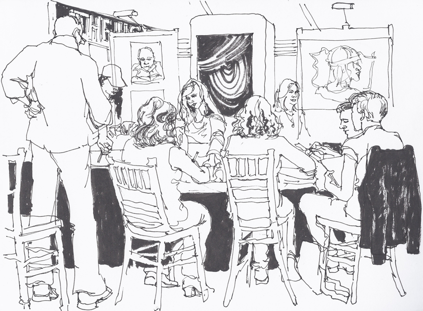 A few days later, my husband and I went up the hill to a winery where the first batch of La Cotte wine - made from grapes from the estate that we were on - was being bottled. These guys had to work like clockwork passing the bottles from pallet to washer to packer to filler... during a short break while they waited for more empty bottles to arrive, they came and had a look what I was doing and I said I'd email them a copy if they could give me an address... which caused a slight hiccup in the proceedings and suddenly there was breaking glass, red wine gushing out onto the floor and some frantic smashing and tugging to get the broken bits out of the machine! I did feel bad, but only three bottles were lost, and I was told the bottlers were happy to be drawn, and they will get their copies! I didn't capture the loud banter, laughter and repartee that started after I been drawing for a while, all in the local vernacular, which I can follow if spoken slowly and clearly, not at 900 words a minute with clinking bottles and machinery as soundtrack (I did catch "teken" = draw!)